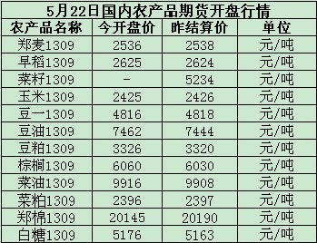 5月22日國(guó)內(nèi)農(nóng)產(chǎn)品期貨開(kāi)盤(pán)行情 發(fā)布時(shí)間:2013-5-22 周三國(guó)內(nèi)農(nóng)產(chǎn)品期貨開(kāi)盤(pán)行情: