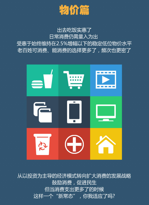 本文來(lái)源于:新華網(wǎng) 發(fā)布時(shí)間:2014-9-19 新華網(wǎng)北京9月17日電(記者 邱小敏 廖佳)一個(gè)新的名詞正為越來(lái)越多人所熟悉——“新常態(tài)”。隨著中國(guó)經(jīng)濟(jì)進(jìn)入新常態(tài),變化的不只是政策導(dǎo)向、產(chǎn)業(yè)布局和官員心態(tài),還有普通百姓的日常生活。 物價(jià):吃飯實(shí)惠了 日常消費(fèi)仍需量入為出
