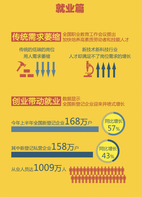 經(jīng)濟(jì)增速放緩了,就業(yè)會(huì)不會(huì)受到影響?經(jīng)濟(jì)結(jié)構(gòu)調(diào)整了,工人會(huì)不會(huì)丟掉“飯碗”?大規(guī)模刺激政策取消了,失業(yè)率會(huì)不會(huì)上升? 7月29日,習(xí)近平總書記主持召開(kāi)中共中央政治局會(huì)議,指出“要著力保障改善民生,繼續(xù)完善就業(yè)創(chuàng)業(yè)扶持政策! 事實(shí)上,隨著簡(jiǎn)政放權(quán)、定向調(diào)控、相關(guān)產(chǎn)業(yè)財(cái)稅扶持政策等多項(xiàng)改革舉措的步步落子,創(chuàng)業(yè)環(huán)境前所未有的寬松。 江蘇省靖江市,三艾網(wǎng)絡(luò)科技有限公司是一家剛剛起步的互聯(lián)網(wǎng)企業(yè)。在相關(guān)產(chǎn)業(yè)和財(cái)政政策的扶持下,該企業(yè)享受到了減半征收企業(yè)所得稅的福利,年節(jié)約成本41016元。同時(shí)還吸納100多名大學(xué)生就業(yè)。 新常態(tài)下,以創(chuàng)業(yè)帶動(dòng)就業(yè)漸成“新風(fēng)景”。數(shù)據(jù)顯示,全國(guó)新登記企業(yè)迎來(lái)井噴式增長(zhǎng),今年上半年全國(guó)新登記企業(yè)168萬(wàn)戶,同比增長(zhǎng)57%。其中新登記私營(yíng)企業(yè)158萬(wàn)戶,從業(yè)人員達(dá)1009萬(wàn)人,同比增長(zhǎng)43%。 9月9日,李克強(qiáng)總理在與出席2014夏季達(dá)沃斯論壇的企業(yè)家代表對(duì)話交流時(shí)透露,截至8月份,今年城鎮(zhèn)新增就業(yè)已經(jīng)接近1000萬(wàn),接近全年目標(biāo)。 不過(guò)應(yīng)該看到,靚麗數(shù)字背后,仍然存在就業(yè)結(jié)構(gòu)性矛盾,傳統(tǒng)的低端的崗位用人需求萎縮,而與新技術(shù)新科技聯(lián)系緊密的行業(yè),人才卻滿足不了崗位需求的增長(zhǎng)。 今年6月,國(guó)務(wù)院召開(kāi)全國(guó)職業(yè)教育工作會(huì)議,明確提出加快培養(yǎng)高素質(zhì)勞動(dòng)者和技能人才,正是意在為推動(dòng)經(jīng)濟(jì)發(fā)展和保持比較充分就業(yè)提供支撐。 收入:城鄉(xiāng)差距漸縮小 百姓理財(cái)更趨多元