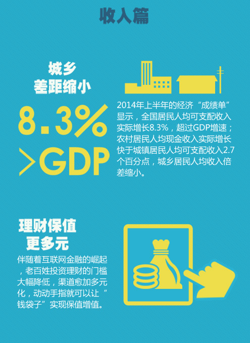 收入是民生之源。百姓對(duì)于經(jīng)濟(jì)好壞最直觀的感受,莫過(guò)于收入的增減。 2014年上半年的經(jīng)濟(jì)“成績(jī)單”顯示,全國(guó)居民人均可支配收入實(shí)際增長(zhǎng)8.3%,超過(guò)GDP增速;農(nóng)村居民人均現(xiàn)金收入實(shí)際增長(zhǎng)快于城鎮(zhèn)居民人均可支配收入2.7個(gè)百分點(diǎn),城鄉(xiāng)居民人均收入倍差縮小。 但在經(jīng)濟(jì)格局轉(zhuǎn)型變化的背景下,不同行業(yè)的民眾也出現(xiàn)了冷暖兩知的情況。 一方面,服務(wù)業(yè)特別是現(xiàn)代服務(wù)業(yè)飛速發(fā)展,為越來(lái)越多的人提供了更為廣闊的就業(yè)渠道和更具吸引力的薪酬。 而另一方面,隨著經(jīng)濟(jì)結(jié)構(gòu)的調(diào)整,鋼鐵、船舶、煤炭等產(chǎn)能過(guò)剩行業(yè)舉步維艱,許多企業(yè)出現(xiàn)減發(fā)、欠發(fā)、緩發(fā)工資的現(xiàn)象,一部分人收入受到影響。 與此同時(shí),伴隨著互聯(lián)網(wǎng)金融的崛起,老百姓投資理財(cái)?shù)拈T檻大幅降低,渠道愈加多元化,“動(dòng)動(dòng)手指”就可以讓“錢袋子”實(shí)現(xiàn)保值增值。 種種變化,源于以“穩(wěn)增長(zhǎng)、調(diào)結(jié)構(gòu)、促改革、惠民生”為目標(biāo)的一系列政策指引。 8月29日,中共中央政治局召開(kāi)會(huì)議,審議通過(guò)了《中央管理企業(yè)負(fù)責(zé)人薪酬制度改革方案》,更是直接向央企高管動(dòng)輒數(shù)十萬(wàn)、上百萬(wàn)的年薪“動(dòng)刀”。 “深化收入分配體制改革,努力縮小收入差距”,新一屆領(lǐng)導(dǎo)集體在執(zhí)政伊始就已明確的目標(biāo),正逐步走向現(xiàn)實(shí)。 樓市:樓還是那些樓 市已不是那個(gè)市