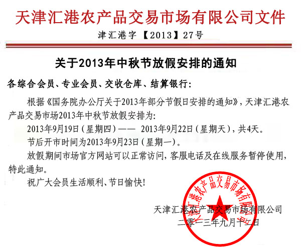上一條:關(guān)于天津匯港農(nóng)產(chǎn)品交易市場(chǎng)出入金時(shí)間調(diào)整的公告[ 2013-9-2 ] 下一條:關(guān)于2013年國(guó)慶節(jié)放假安排的通知[ 2013-9-24 ] |