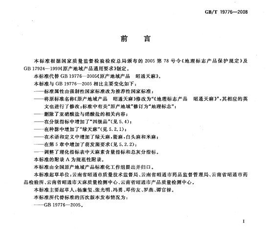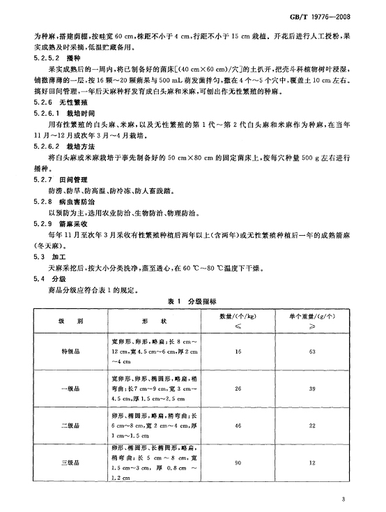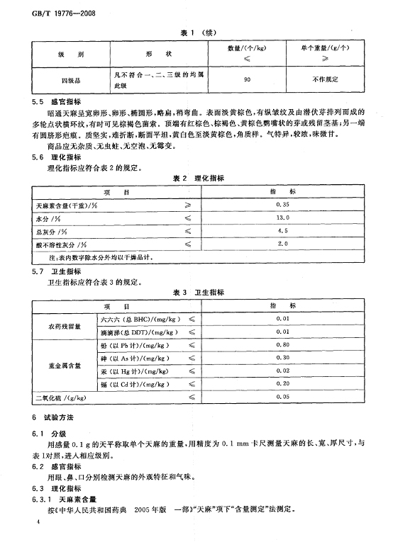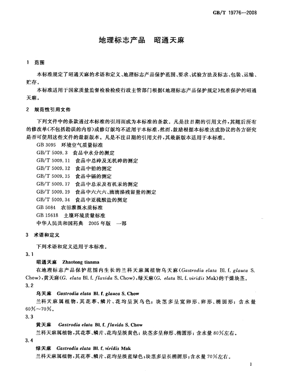 天麻交收品質(zhì)要求:外觀呈寬卵形、卵形、橢圓形,略扁,稍彎曲;長(zhǎng)6 cm~12 cm,寬2cm~6 cm,厚1 cm~4 cm;數(shù)量/ (個(gè)/kg)≤46,單個(gè)重量/(g/個(gè))≥22;感官指標(biāo)、理化指標(biāo)、衛(wèi)生指標(biāo)、檢驗(yàn)方法、包裝和貯存要求等按照《中華人民共和國(guó)國(guó)家標(biāo)準(zhǔn) 地理標(biāo)志產(chǎn)品 昭通天麻》[GB/T 19776-2008](附件一)執(zhí)行。 附件一: